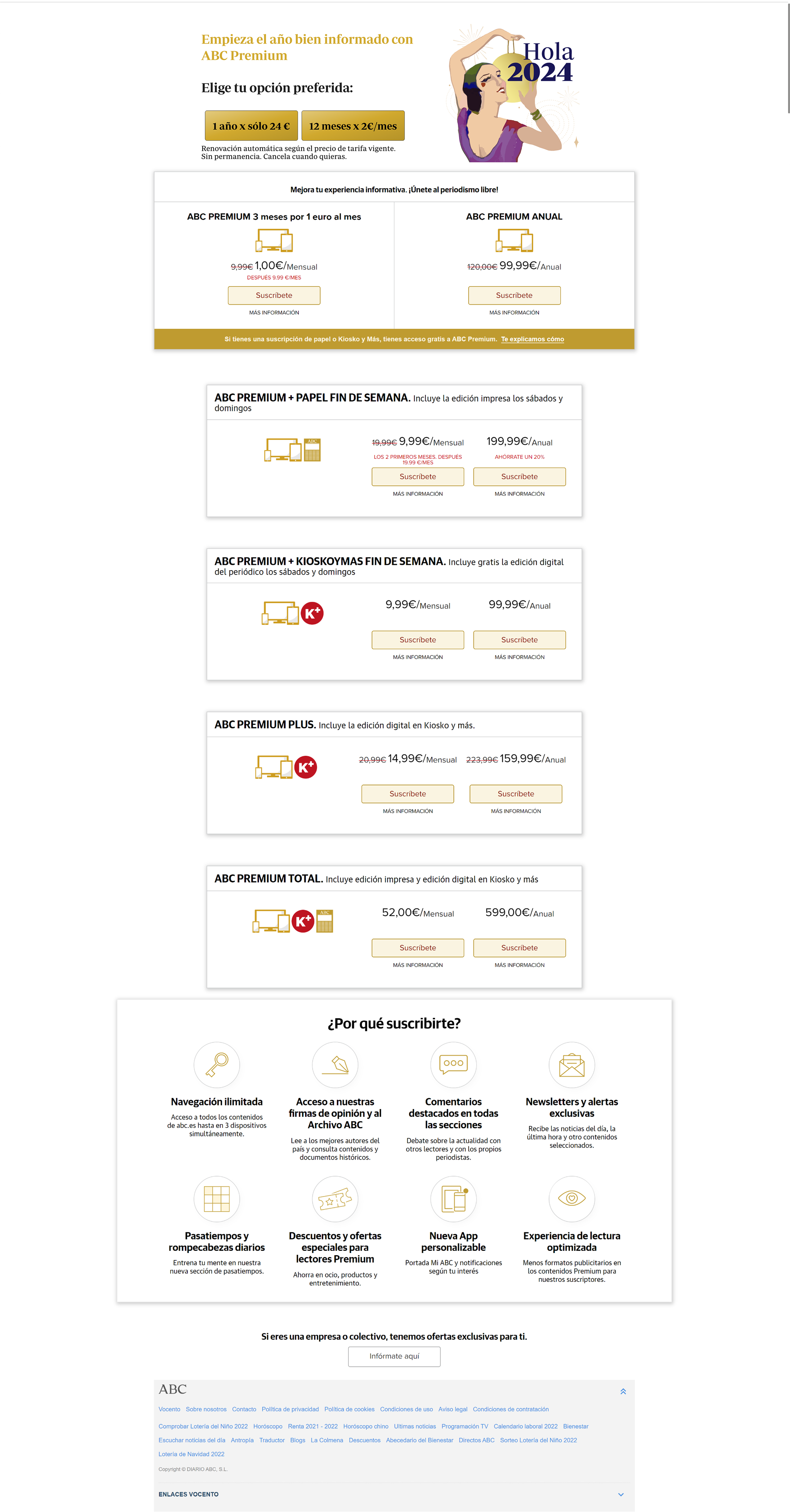The regional bundle integrated Vocento's local newspapers into the same subscription architecture. Subscribers could combine ABC with regional titles — El Correo, Diario Vasco, Diario Montañés, El Comercio, La Rioja, Las Provincias, El Norte de Castilla, Hoy, Sur, Ideal and La Verdad.