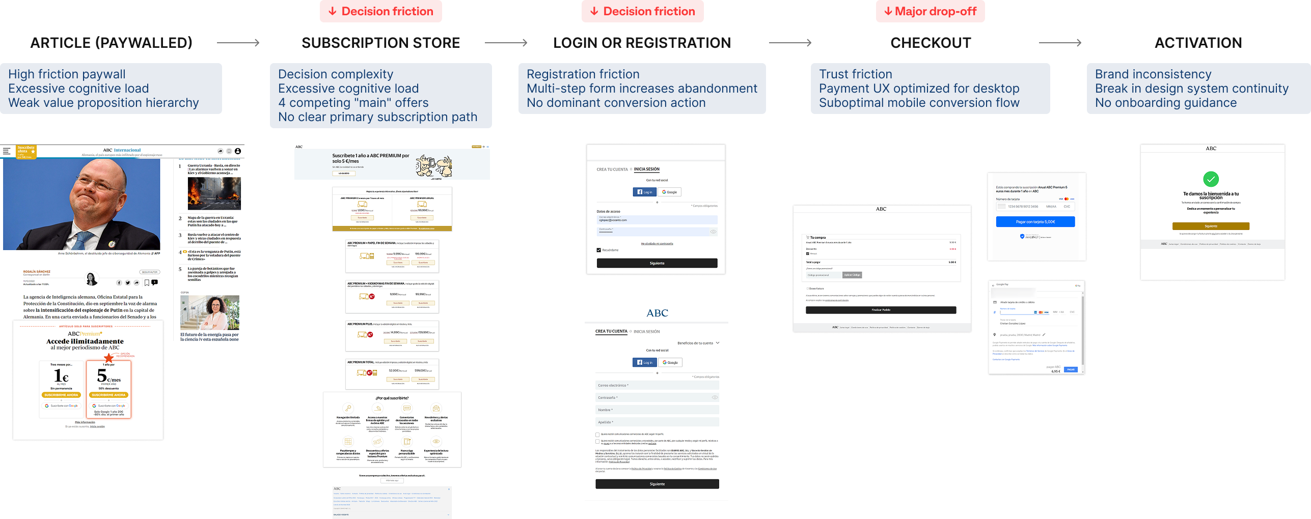 Subscription decision journey Low scannability, weak hierarchy and complex decision paths introduced friction across every stage of the funnel.